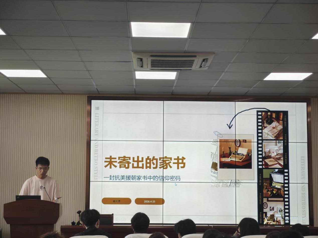 红色故事与英雄精神:曹贝贝同学分享了长征、抗战中的红色故事,并解读了其精神内涵与时代意义;谢兆博同学通过抗美援朝家书讲述了信仰的力量,解读了英雄精神与青年担当;赵雨萌同学以“铭记英雄,薪火领航”为主题,分享了对英雄精神的理解,号召青年传承红色薪火、勇担时代使命;马小琴同学以“清澈的爱,只为中国”为主题,致敬戍边英雄陈祥榕,解读这份纯粹信仰背后的爱国精神与青年担当;邱钰同学讲述了革命烈士陈延年“站着死,不跪下”的英雄事迹,展现了其追求真理、心系家国的革命精神。